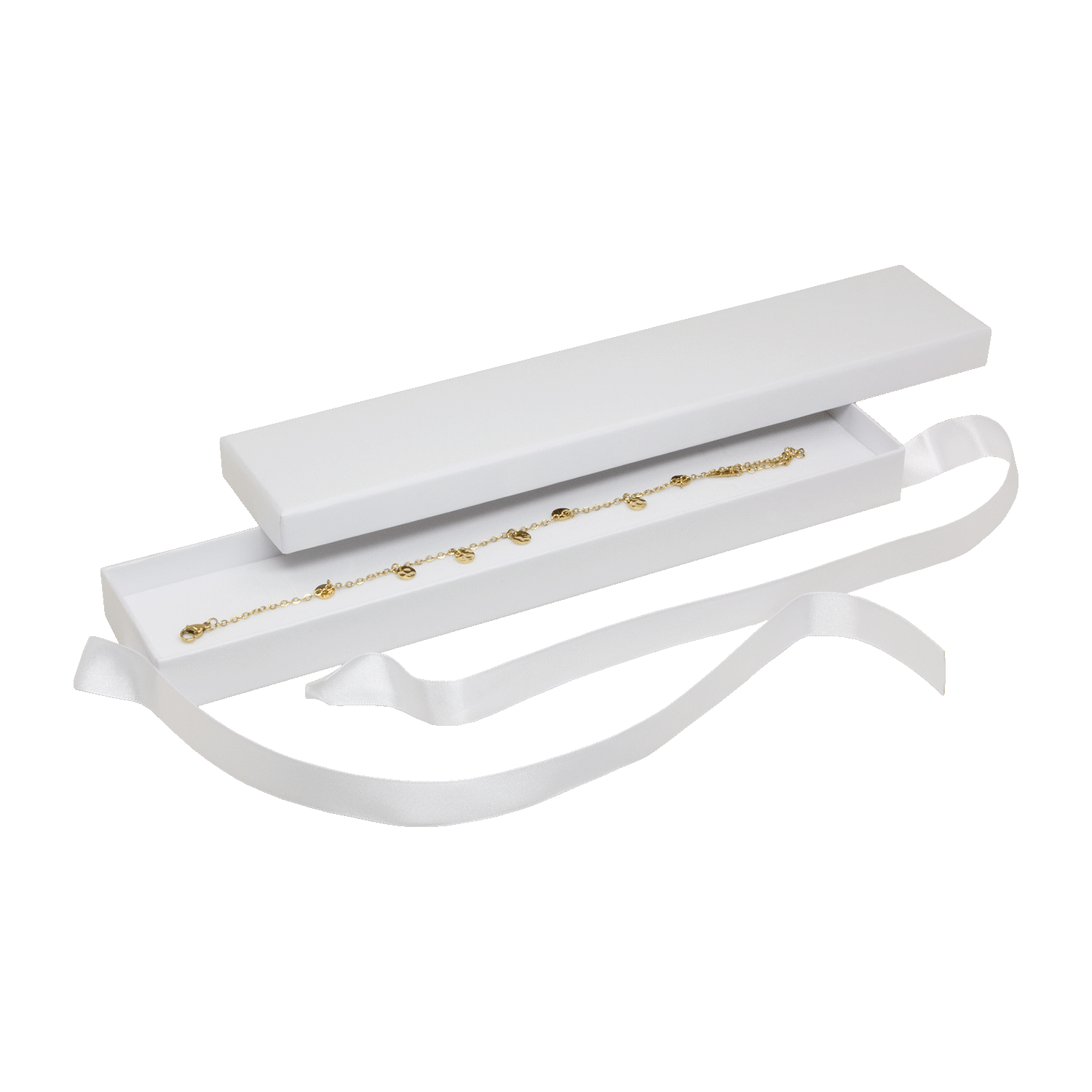 The Jewellery box of the series 0276 LOOP in elegant white offers the ideal Packaging solution for bracelets and watches. With dimensions of 255 x 50 x 20 mm, it provides ample space for your high-quality products. The lining consists of a laminated foam insert in white, which securely and stylishly presents your jewellery items. Do you wish to personalise your box? No problem! With the option of hot foil embossing on the outside or inside, in gold, silver, black, or almost any colour of your choice, you can customise your Packaging. Multi-coloured embossing is also available at an additional charge. The Jewellery box of the series 0276 LOOP combines functionality with stylish design and offers your jewellery and watches an elegant FRAME. Discover now the diverse customisation options to perfectly showcase your products.
