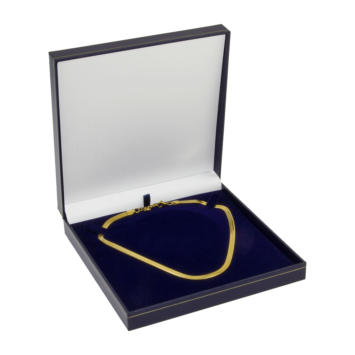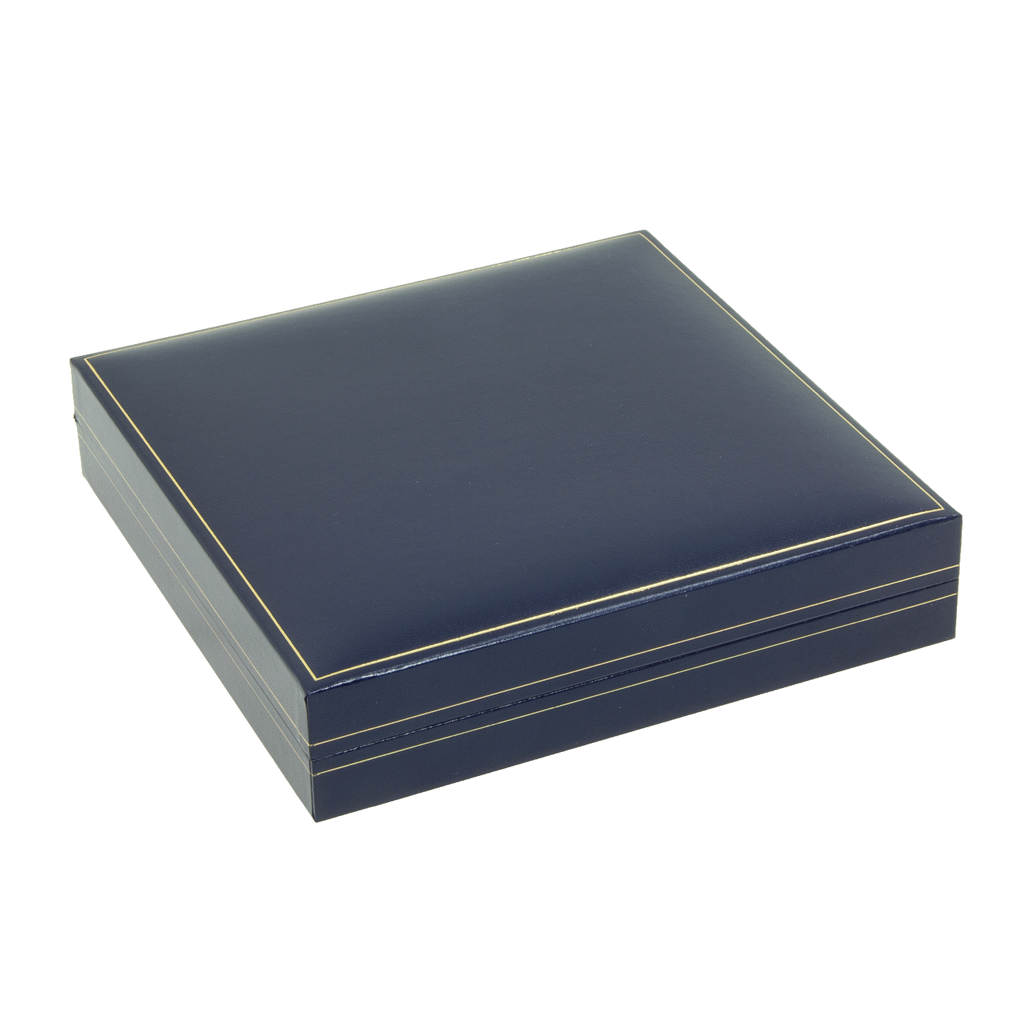 The high-quality jewellery cases from the 5516 MANHATTAN series in the exterior colour blue are the perfect choice for jeweller retailers, goldsmiths, and jewellery brands looking for high-quality packaging for necklaces and collier necklaces. With dimensions of 165 x 159 x 29 mm, they offer ample space and protection for your jewellery pieces. The interior lining consists of a jewellery-related insert in white and blue, stylishly presenting your products. A special feature of these high-quality jewellery cases is the option for customisation through hot foil stamping on the inside. Choose from gold, silver, black, or almost any colour of your choice for your stamping. For an additional charge, multicoloured stampings are also possible to make your packaging even more unique. Opt for quality, style, and individuality for your jewellery collections with the high-quality jewellery cases from the 5516 MANHATTAN series.